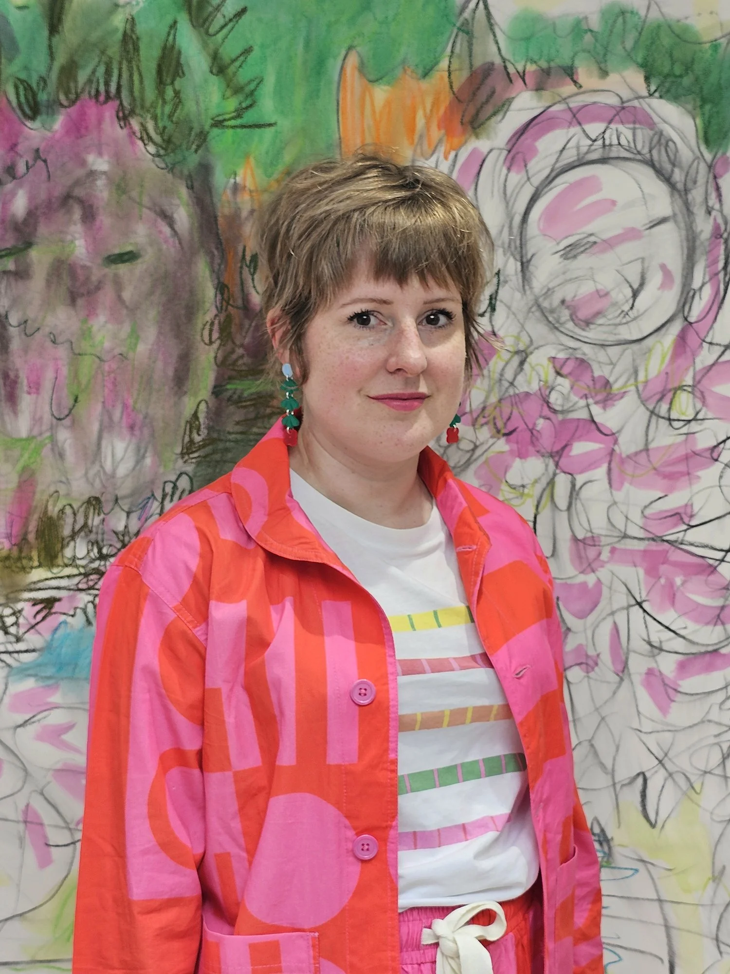 Louisa Chambers’ current practice begins in the everyday—suburbia, boredom, routine and overlooked wild spaces at the edges of urban environments. Drawing from both observation and memory, she explores shifting relationships with self, space and environment through a childlike lens of curiosity and unease. Figures emerge—peeping, morphing, watching—alongside a recurring bird-like creature, an alter ego born from her experience of matrescence, the transformation of becoming a mother. Recently, her practice has embraced intuitive mark-making within drawing and painting processes, allowing imagined worlds to surface—hybrid spaces between the familiar and the fantastical. Ultimately, her work reframes the mundane into something strange and otherworldly. Chambers graduated from the Royal College of Art in 2007 (MA Painting), is Resident Artist at Primary in Nottingham and Senior Lecturer in Fine Art at Nottingham Trent University. She has recently completed studying Online Drawing Development Year 2025 at the Royal Drawing School.